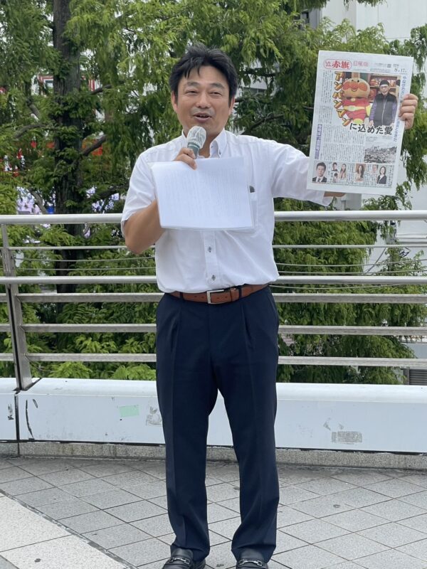 この節目の日に、日本共産党として終戦記念日にあたっての訴えとチラシの配布、海上自衛隊へのトマホークミサイル配備撤回を求める署名を行いました。