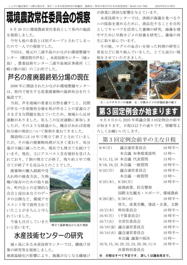 今号では、原水爆禁止世界大会に参加したことや8月15日の終戦記念日の宣伝、ひとりで行った環境農政常任委員会の県内視察について掲載しました。